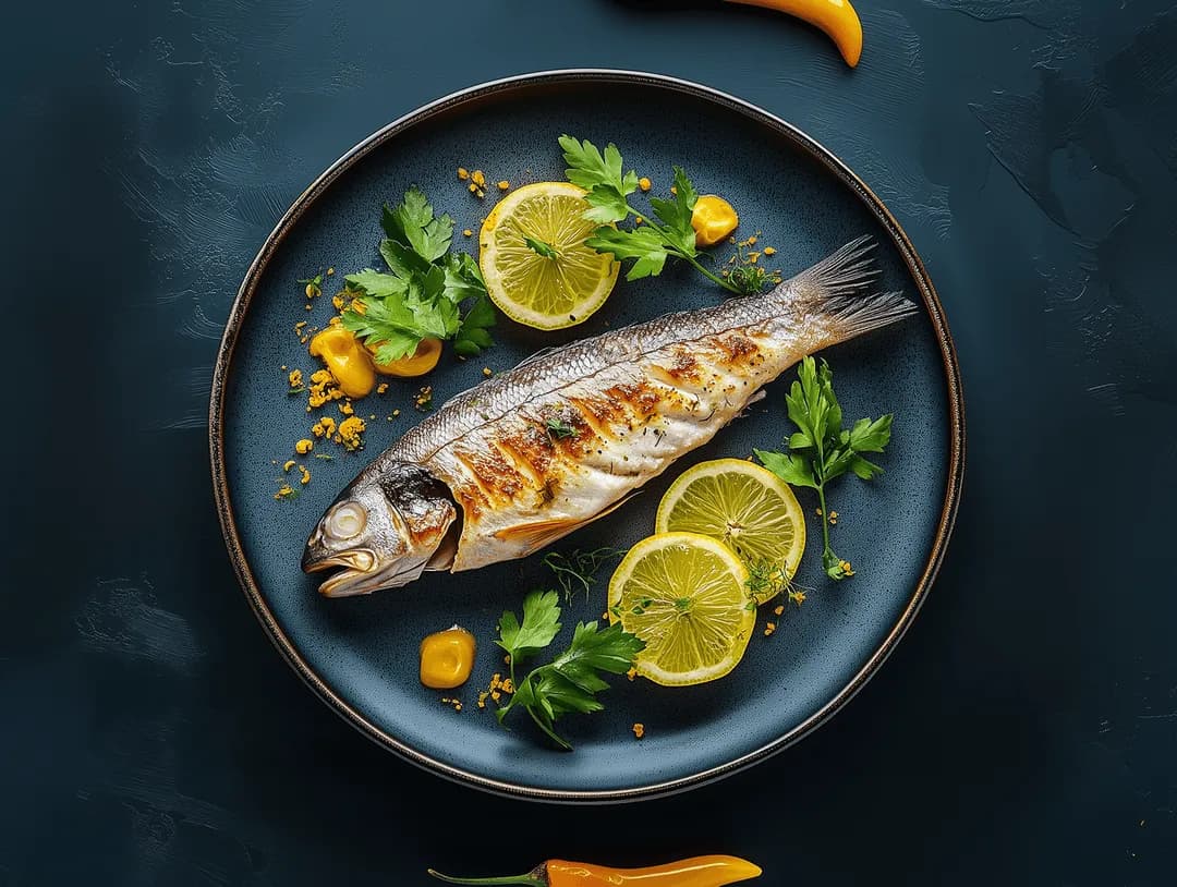 Whole Mediterranean sea bass oven-roasted with fresh herbs, garlic, and olive oil.